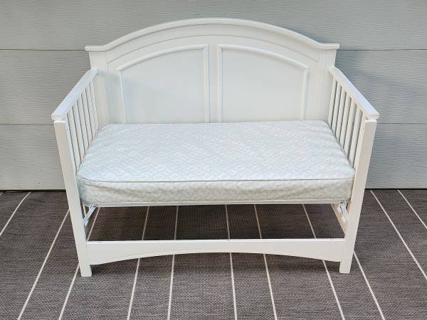 Very clean and in excellent condition, white wood construction, vinyl mattress cover in place, 48"x 24", mattress height is adjustable.